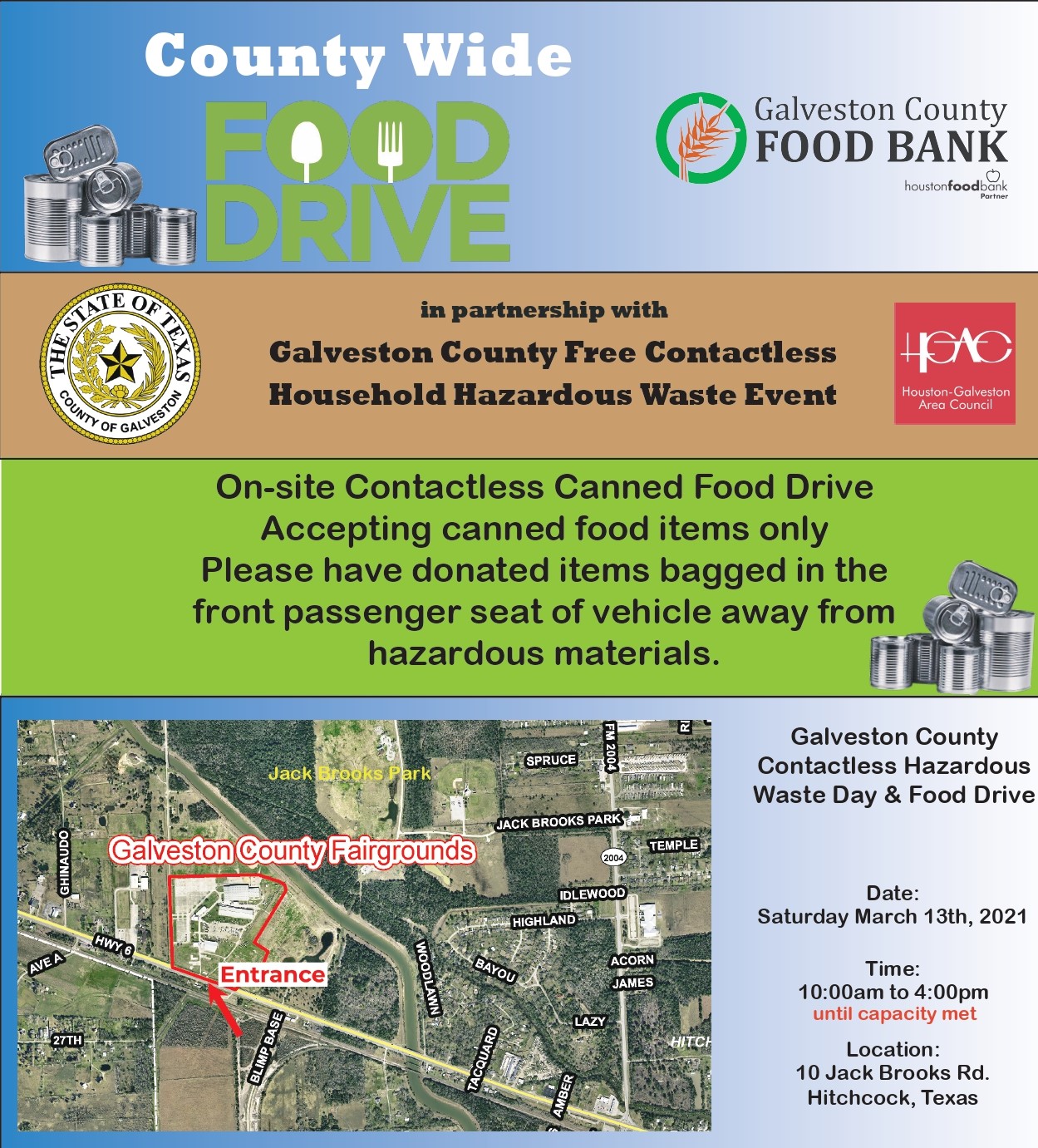 The Galveston County Food Bank will be collecting canned food donations during the Galveston County Household Hazardous Waste Event. We ask that food donation are bagged and in the front passenger seat of your vehicle, not around any hazardous materials. Only canned goods will be accepted. No glass or perishable food items please.