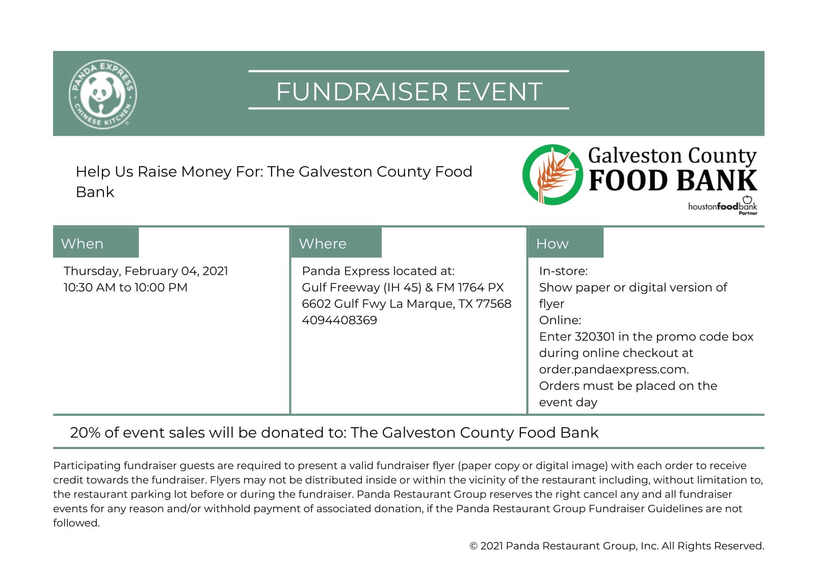 Pick up lunch or dinner at Panda Express in La Marque on Thursday February 04, 2021 and they will donate 20% of your purchase to the Galveston County Food Bank!